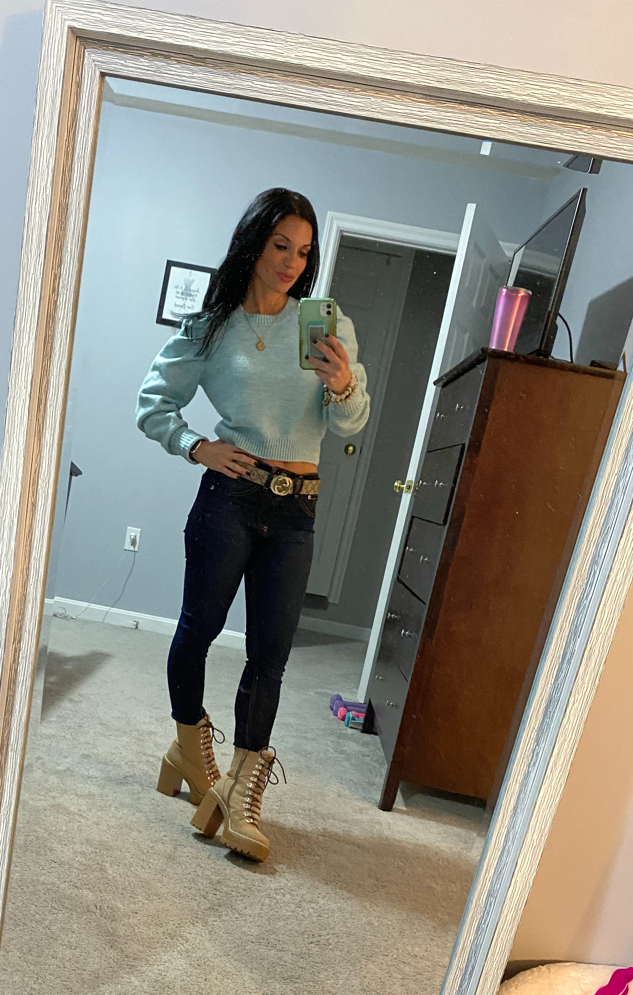 8. Spring Colored Sweaters: Pastels will be big again people for Spring 2021. I decided to get a jumpstart on the Spring transition and pair it up with boots.