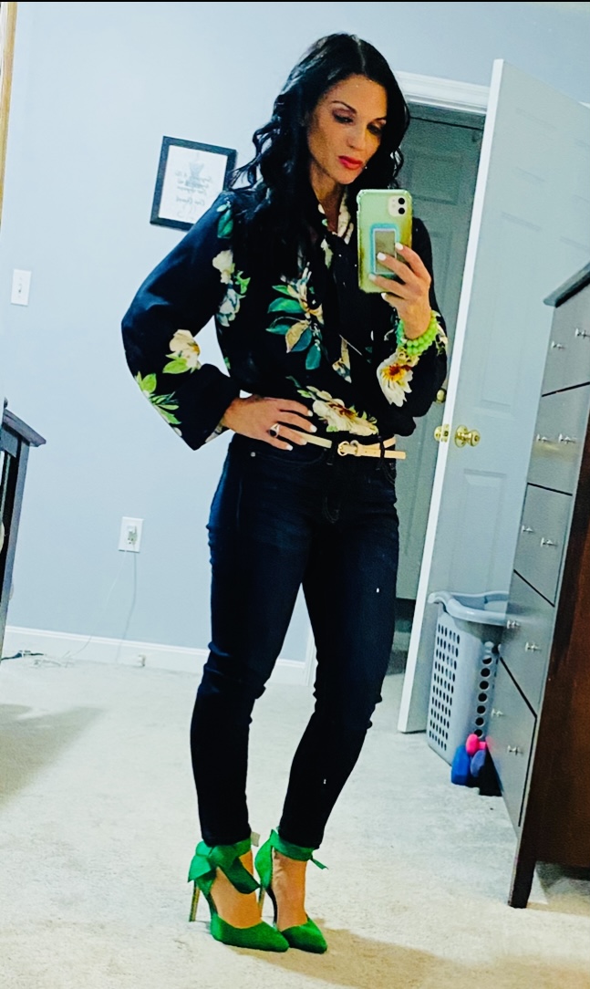 5. Floral blouse and jeans: